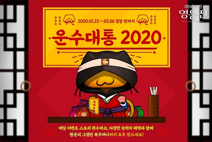 ‘마비노기 영웅전’에서는 23일부터 2월 6일까지 게임 접속 시 지급되는 ‘운수대통 복채 주머니’를 가지고 콜헨 마을 NPC ‘이상한 여행자’를 통해 ‘[이벤트: 운수대통 2020] 스토리’를 진행하면 ‘운수대통 2020’과 ‘새해 부적’을 얻을 수 있다. ‘운수대통 2020’을 사용하면 ‘공격력/마법공격력 +500 스크롤’, ‘공격속도 +5 스크롤’ 등 능력치 강화 효과를 사용 가능하며, ‘새해부적’은 전용 교환 상점에서 ‘행운의 그렘린 복주머니’, '프리미엄 매혹의 룬' 등의 아이템으로 교환할 수 있다.