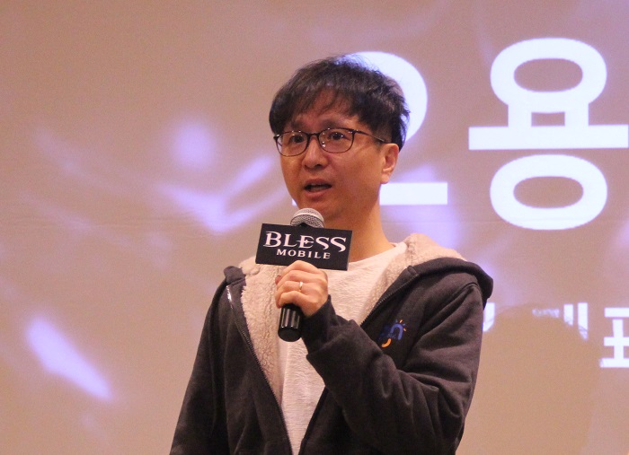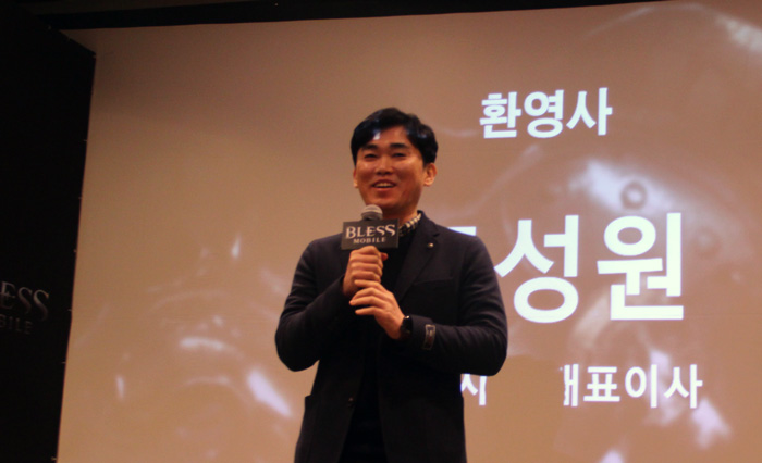 이어서 씽크펀 '오용환' 대표는 "블레스모바일을 통해서 씽크펀의 첫 출발을 알리는 자리"라고 입을 열었다. 또, "블레스모바일이 있기까지 많은 노력을 기울인 모든 분들께 감사하다"면서 고마움을 표했다. "탄탄한 원작을 베이스로, 여기에 우리의 기술력을 함양시켜 더욱 높은 퀄리티의 작품으로 진화시켰다"고 설명했다.