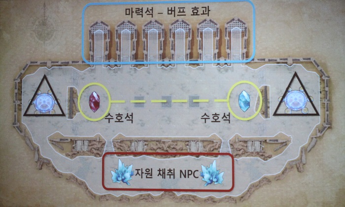 마지막으로 소개한 콘텐츠는 길드 간 PvP인 '분쟁전'이다. 길드 단위로 매주 1회 대규모 전쟁이 펼쳐지는데, 맵 내에서 각종 자원을 채취하고 해당 자원을 전략적으로 이용해 상대방 진영의 수호석을 파괴하는 방식이다. 또, 마력석을 통해서 버프 효과를 얻을 수 있으며 적의 자원 채취 NPC를 처치하고 아군 자원 채취 NPC를 보호해 자원을 효과적으로 확보해야만 승리할 수 있다. 이어서 영상에서는 공성 병기가 등장하는 등, 전략적인 전투가 펼쳐지는 것을 확인할 수 있었다.