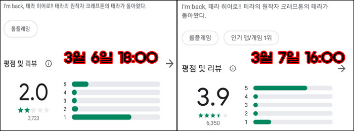단, 테라히어로의 경우 이미 수 천단위의 평가가 결정된 상태에서 특별한 업데이트나 공지없이 올라갔다는 것은 확실히 이례적이라 할 수 있다. 구글 플레이스토어 평균 평점이 적게는 수 시간 길게는 24시간 이상의 시간이 경과 후 적용된다는 것을 감안해도 그야말로 극적으로 뒤바뀐 셈이다.