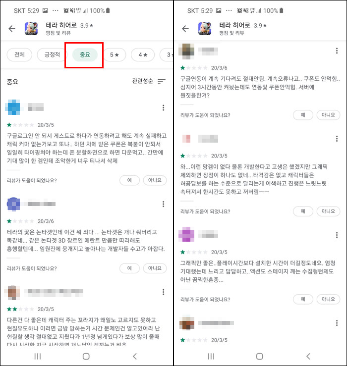 참고로 구글 플레이스토어 평점 기능 중 기본으로 제공하는 중요 평점 부분의 상위 100개 리뷰 평균은 1.3점으로 평점 1점이 80개, 2점과 3점이 각각 10개씩이며 4점과 5점은 1건도 없다. 현재 5점이 압도적으로 많은 것과 비교하면 사뭇 분위기가 다른 것을 확인할 수 있다.