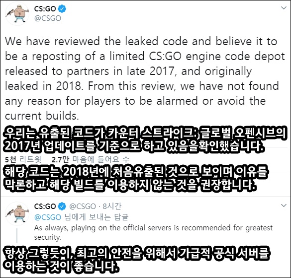밸브 측에서도 안전한 게임 이용을 위한 지침을 내리고 있는 상황 = 카운터 스트라이크:글로벌 오펜시브 공식 트위터