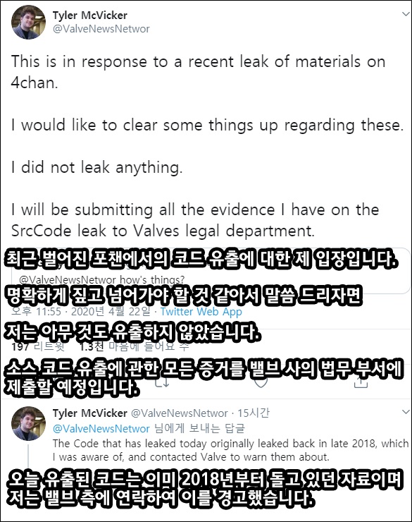 이에 대하여 VNN 채널의 운영자 타일러 맥비커(Tyler McVicker)는 '최근 유출된 것으로 알려진 소스 1 엔진 코드는 이미 2018년도 후반부터 암암리에 유통되고 있었고 자신은 이를 알고 밸브 측에 연락하여 경고했으며 최근 벌어진 일련의 사건과 관련이 없다'는 입장을 취하고 있다.