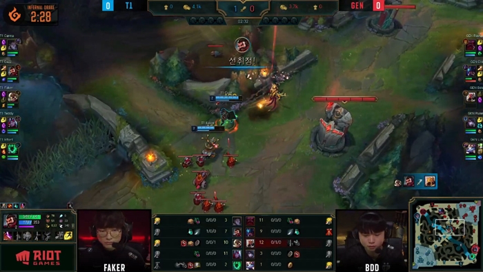 특히 초반 리드를 토대로 페이커의 코르키가 핵심 아이템인 마나무네와 삼위일체를 매우 빠르게 갖추면서 바텀 라인전을 리드하는 테디(박진성)의 바루스와 함께 살벌한 포격전을 보여줬고 오른의 궁극기는 사일러스가 그대로 복사하여 받아치며 전투 개시를 억제하였다.
