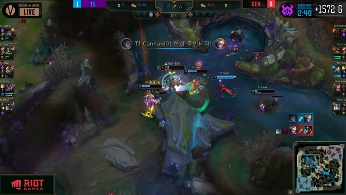 가장 압권인 것은 19분에 있었던 칸나의 1:2 상황 솔로킬이었다. 13레벨을 달성하면서 패시브 효과로 엄청난 탱킹력을 갖춘 오른이 제이스-세주아니를 상대로 주머니에서 물건 꺼내듯이 제이스의 목숨을 가져갔고 세주아니가 라인클리어를 위해 바텀에 발이 묶인 사이 순간이동으로 합류한 덕분에 티원은 20분이 되자마자 나온 바론 버프를 획득했다.