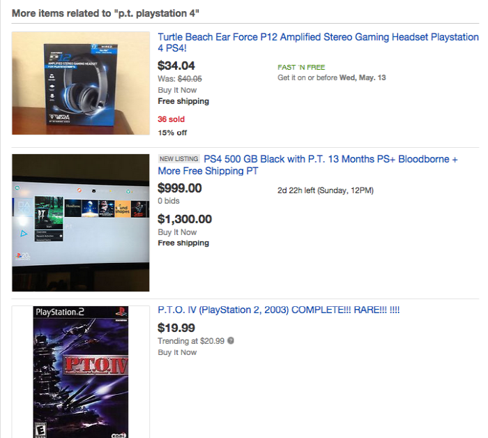 그러나 코나미 부사장이었던 코지마가 일반 사원으로 강등당하더니 결국 기예르모가 인터뷰에서 사일런트 힐즈가 출시되지 않을 것을 언급하면서 개발 중단 사실이 알려졌다. 이후 코나미는 P.T.를 플레이스테이션 스토어에서 삭제하는데 이어 팬들이 제작한 PC 리메이크 버전을 삭제하면서 작품의 흔적을 모두 지워버렸다. 이로 인해 P.T.가 설치된 플레이스테이션4가 경매 사이트인 이베이에 무려 999 달러에 등록되기도 했다. 해당 경매는 곧 내려갔지만, 한때 경매가가 1,300 달러까지 오르기도 했다.