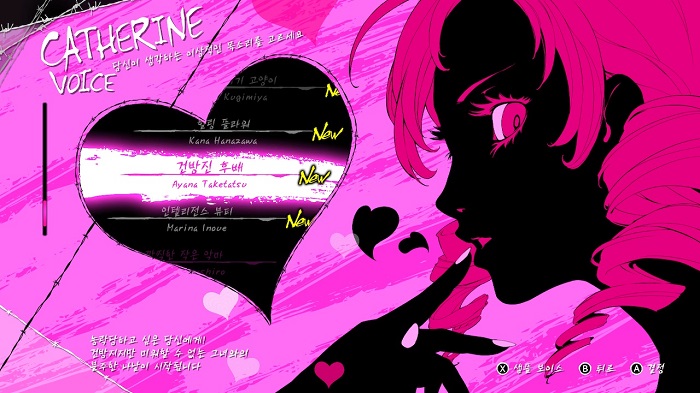 주인공 중 한 명인 Catherine은 빈센트가 생각하는 이상형의 모습으로 나타난다. 그렇기 때문에 목소리도 취향에 맞춰 변경할 수 있게 되었다.