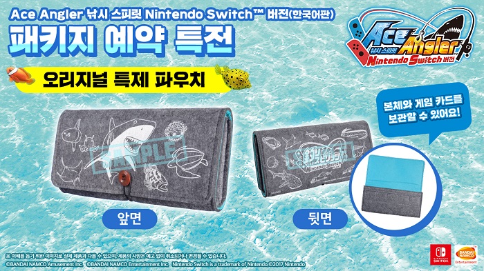 ‘Ace Angler 낚시 스피릿 닌텐도 스위치 버전’(한국어판) 패키지 버전의 예약 판매가 7월 7일부터 시작된다. 예약 특전으로는 닌텐도 스위치 본체와 게임 카드를 보관할 수 있는 오리지널 특제 파우치를 제공한다.