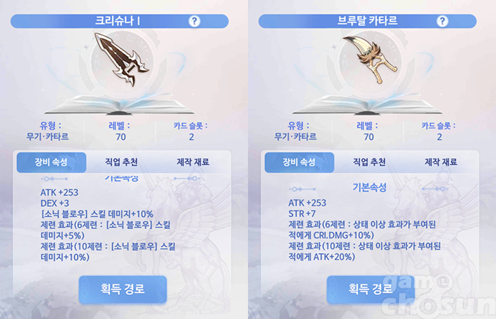 만약 광역 피해를 고려해 '그림투스'를 채용한다면 상태 이상 효과가 부여된 적에게 ATK 상승 효과를 가지고 있는 '브루탈 카타르'도 하나의 선택지가 되겠다. 다만, 브루탈 카타르의 옵션을 제대로 활용하려면 상태 이상이 발동돼야 하며, 제련을 10까지 투자해야 한다.