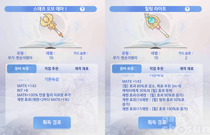 힐러는 마법사와 같은 고민에 빠지면 된다. 즉, 10제련 이하라면 '생존의 지팡이'나 '스태프 오브 데아', 10제련 이상이라면 새로운 무기인 '힐링 라이트'를 선택하는 것이다.