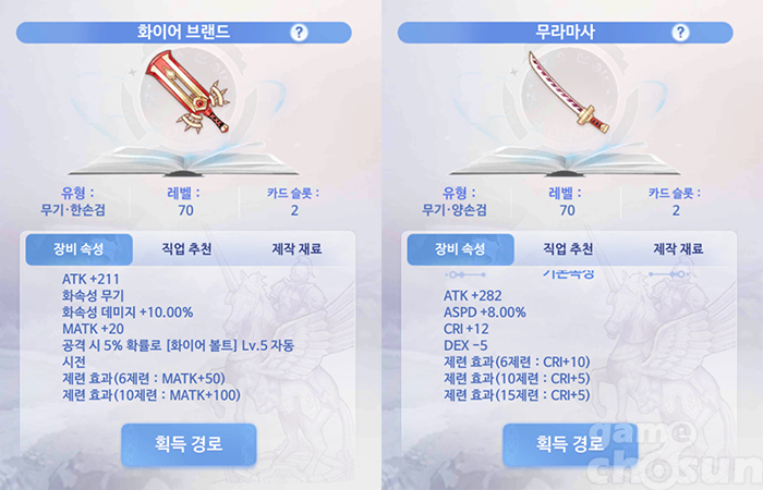 검을 사용하는 '나이트'는 '소드 퀴큰'을 사용해 빠른 공격이 가능하다. 그래서 '화이어 브랜드'처럼 자동 스킬 시전이나 '무라마사'의 크리티컬 강화 옵션과 궁합이 잘 맞는 직업이다. 특히 무라마사의 경우 '라그나로크 온라인'과 다르게 시전자에게 저주를 거는 옵션이 사라져 LUK에 대한 의존도가 많이 줄어들었다.