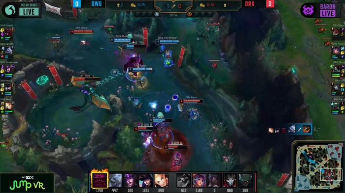 LPL에서는 중체미로 꼽히는 나이트(줘딩)의 히든카드로 쓰이지만 LCK에서는 시즌 내내 그리 많이 나오지 않은 '신드라'를 담원 측에서 선픽 카드로 활용하는 모습을 보여줬다. 특히 탑 라인에서 칼과 칼의 대결이 나올 것이라는 예상과는 달리 담원이 마지막까지 숨겼던 마지막 챔피언은 오른이었다.