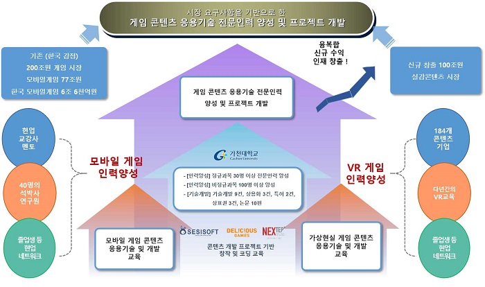사업 실무를 맡은 김정윤 교수(가천대학교 게임대학원)는 현장에서 요구하는 즉시 필요한 기술과 교육과정의 요구사항을 자체 수요조사를 진행하였다. 수요조사기반 인력양성의 목표는 ▲정규과목 54학점 운영, 30명 이상 전문 인재 양성 ▲비정규과목 7건 운영 100명 이상 양성을 목표로 설정하였으며, 기술개발의 목표는 ▲현장에서 즉시 활용 가능한 게임 응용기술 개발 △3년간 총 9개의 산학협력 기술개발, 3개 시범콘텐츠 서비스로 주관/참여 공동 교육 및 기술개발을 통하여 전문 R&D 인력 양성으로 사업의 목표를 설정하였다.