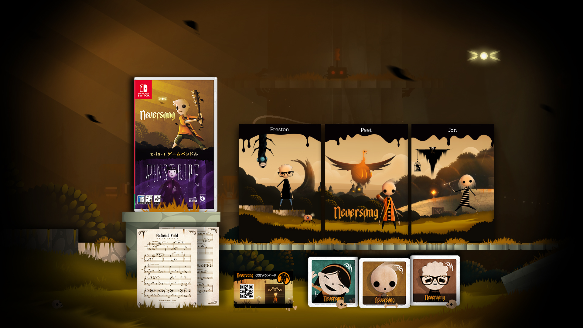 한정 패키지는 전세계 팬들이 기다려온 컬렉터 아이템이다. " 네버송 보너스팩"에는 포스터 (3장), 컵받침 3종 세트, "네버송" 사운드트랙(QR코드로 다운로드), 피아노 악보가 포함되어 있어 게임의 세계뿐만 아니라 현실 세계에서도 마법에 걸린 악곡을 즐길 수 있다. 네버송 보너스팩은 초회판에만 제공된다.