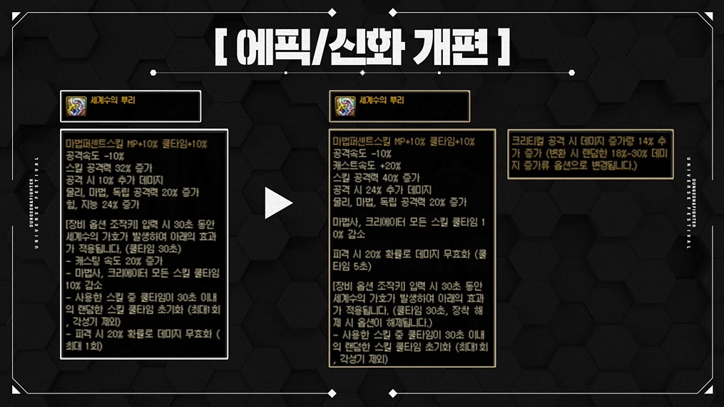 아이템 옵션을 개조하는 것과는 별개로 아이템 밸런싱 조정도 예정되어 있다. 그동안 누적되어온 데이터를 기반으로 모든 100레벨 에픽/신화 등급 아이템의 옵션이 조정될 예정이다.