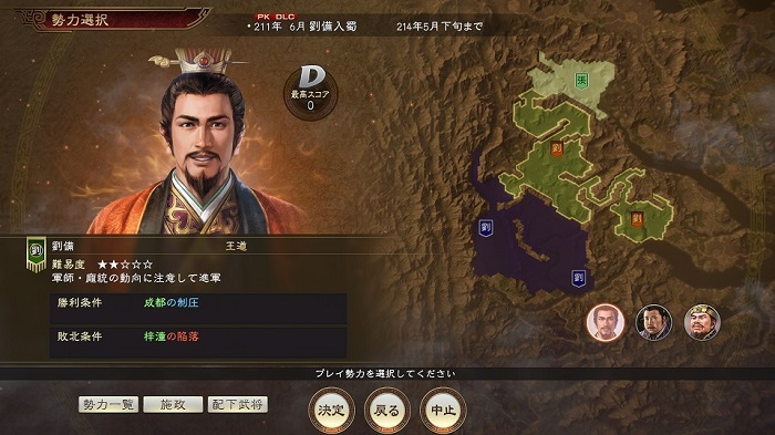 전기제패 시나리오 「유비 입촉」은 211년 6월, 형주를 손에 넣은 유비가 삼국 정립을 향하여 촉나라 땅으로 들어가는 시나리오로, 플레이 가능 세력은 「유비」「유장」「장로」. 이 시나리오 전용 이벤트 「낙봉파」「마초, 귀순」 등도 준비되어 있으며, 삼국지연의의 터닝 포인트를 연출한다.