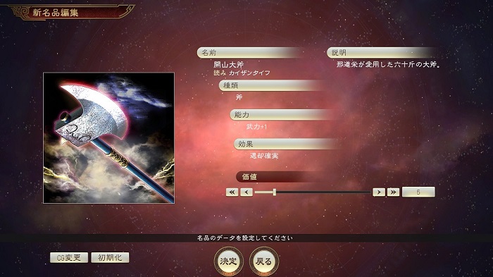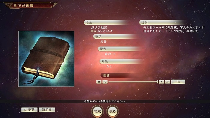 「신명품 생성 기능」은 게임 중에 등장하는 명품을 베이스로 명칭이나 효과를 자유롭게 변경하여 오리지널 명품을 생성할 수 있는 기능이다. 또한 이 시대에는 없었던 실재하는 명품이나 가공의 명품 등을 마음대로 생성할 수 있다.