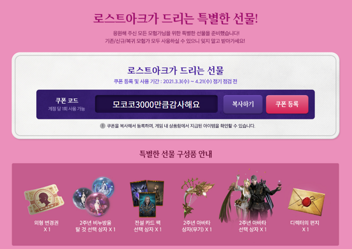 또한 로스트아크를 아껴주는 이용자에게 감사의 마음을 담아 '모코코3000만큼감사해요' 쿠폰을 배포한다고 밝혔다. 해당 쿠폰은 2020년 12월, 로아온 페스티벌 쿠폰과 동일한 구성이며 배포했을 당시 이용자들에게 높은 평가를 받았던 적이 있다. 신규, 복귀 유저에게는 초반 육성에 필요한 재화가 담겨있는 특별 지원 패키지까지 추가로 지급한다.
