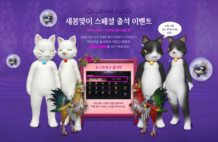이번 감사편지에서 공개한 이벤트는 3월 3일부터 '새봄맞이 감사 이벤트'라는 제목으로 개최하며 '모코코3000만큼감사해요' 쿠폰과 신규/복귀 모험가 특별 지원 패키지 지급은 4월 21일까지, 냥바타를 얻을 수 있는 새봄맞이 스페셜 출석 이벤트는 3월 31일까지 진행한다. 더 자세한 내용은 공식홈페이지를 통해 확인할 수 있다.
