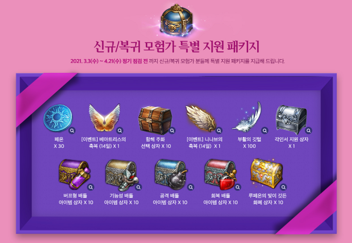 신규, 복귀 이용자에게 주는 추가 선물 = 로스트아크 공식 홈페이지 갈무리