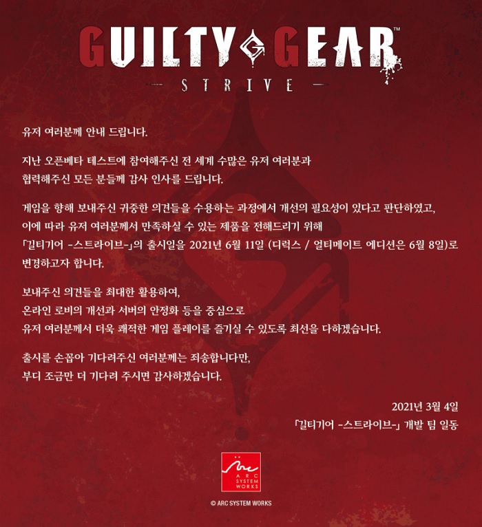 아크시스템웍스 아시아는 자사의 공식 트위터를 통해 길티기어 스트라이브의 출시일 연기를 알렸다. 아크시스템웍스는 지난 오픈 베타 테스트 이후 이용자의 의견을 수용하는 과정에서 개선이 필요하다고 여겼으며 6월 11일로 출시일을 변경했다고 전했다. 이에 선행 발매되는 디럭스와 얼티메이트 에디션 역시 6월 8일 출시로 변경됐다.