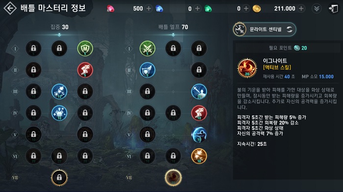 배틀엘프 70, 그리고 집중 30으로 투자했습니다. 배틀엘프의 '이그나이트'가 PvP에 효율이 높기 때문인데요. 전체적인 투자는 공격과 방어에 골고루 한 편입니다.
