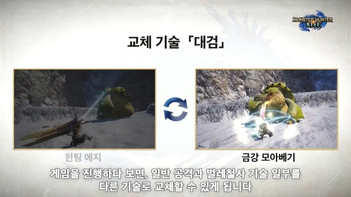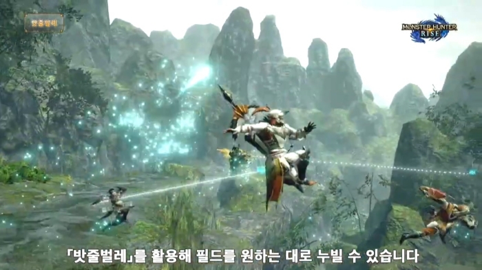 이후 몬스터 헌터 라이즈에서 새롭게 추가될 시스템을 설명했다. 가장 먼저 소개한 시스템은 몬스터 헌터 라이즈의 신규 시스템으로, 공개된 적 있는 '밧줄벌레'를 활용한 액션 질주, 벽 달리기 등의 액션과 벌레 철사 기술, 낙법 등 사용법과 예시에 대해 간략하게 소개했다. 특히 몇몇 벌레 철사 기술은 '교체 기술'로 연계해 사용할 수 있어 다양한 자신만의 테크닉을 구사할 수 있게 됐다.