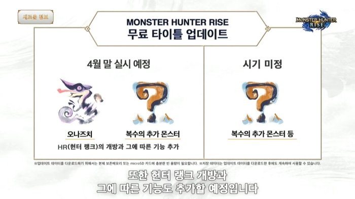 몬스터 헌터 라이즈 출시 이후 업데이트 일정도 공개했다. 먼저 4월 말에 신규 몬스터 '오나즈치'를 포함해 다량의 추가 몬스터가 업데이트 될 예정이며 이 때 헌터 랭크 개방과 그에 따른 기능도 추가된다.