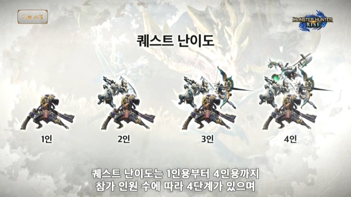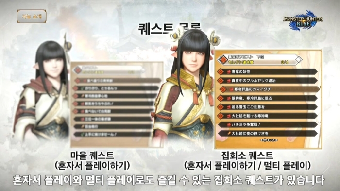 퀘스트 수령 방식 변경점도 자세히 밝혀졌다. 혼자서 즐길 수 있는 '마을 퀘스트'와 혼자서도 즐길 수는 있지만 다른 헌터와 함께 플레이할 수 있는 '집회소 퀘스트'로 나뉘며 멀티플레이는 온라인과 로컬 플레이가 모두 가능할 예정이다. 최대 4명까지 지원하며 퀘스트 난이도는 참가 인원수에 따라 실시간으로 자동 조절된다.