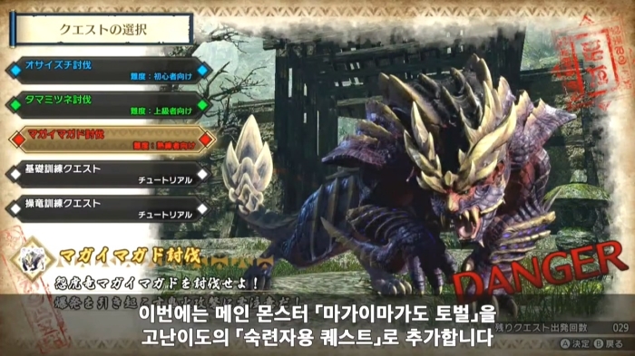 3월 26일 게이머에게 찾아올 몬스터 헌터 라이즈는 두 번째 체험판을 3월 16일에 배포할 예정이다. 2차 체험판은 첫 체험판의 콘텐츠를 포함해 숙련자용 '마가이마가도' 토벌 퀘스트가 추가될 예정이다. 기존 체험판을 플레이했던 적이 있다면 업데이트 데이터를 다운로드해 이용할 수 있으며 퀘스트 출발 횟수 제한 또한 초기화된다. 물론 기존 참여 경험이 없어도 새로이 다운로드해 플레이할 수도 있다.