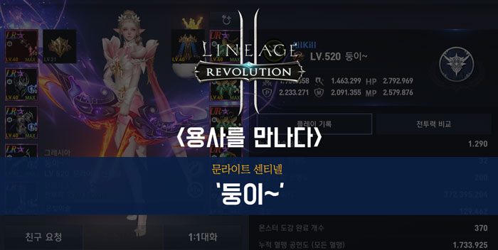 안녕하세요. 그레시아 서버에서 '문라이트 센티넬'을 육성중인 '둥이~'라고 합니다. 리니지2레볼루션이 정식 서비스를 시작한 직후부터 플레이해왔으니 햇수로 6년 차에 접어들었네요.