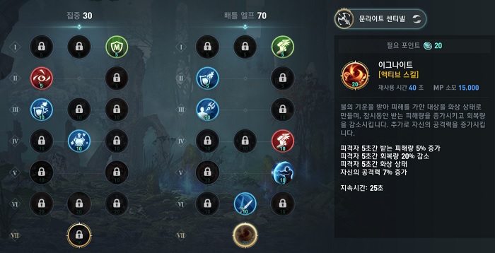 배틀 마스터리는 '이그나이트' 쪽으로 투자했습니다. 이그나이트의 피해량 5% 증가와 공격력 7% 증가는 매우 큰 메리트를 가지고 있습니다. 문라이트 센티넬은 매우 공격적인 클래스인데, 여기에 이그나이트를 활용하면 그 효과를 더욱 배가시킬 수 있습니다.