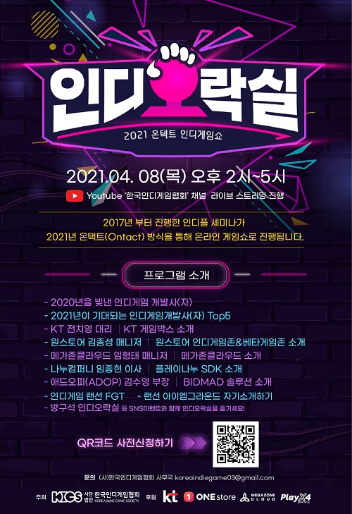 이날 행사는 오후 2시부터 5시까지 진행될 예정이며, 2020년을 빛낸 인디게임 개발사(자), 2021년이 기대되는 인디게임 개발사(자) Top5 등 인디게임을 소개하는 프로그램과 KT 전치영 대리의 KT 게임박스 소개, 원스토어 김종성 매니저의 원스토어 소개와 같은 서비스 플랫폼 담당자가 소개하는 마켓 등록 전략 강연과 메가존클라우드 임형태 매니저의 메가존클라우드 소개, 나누컴퍼니 임종현 이사의 플레이나누 SDK 소개, 애드오피(ADOP) 김수영 부장의 BIDMAD 솔루션 소개와 같은 인디게임 개발에 필요한 다양한 서드파티 툴 강연도 함께 진행된다.