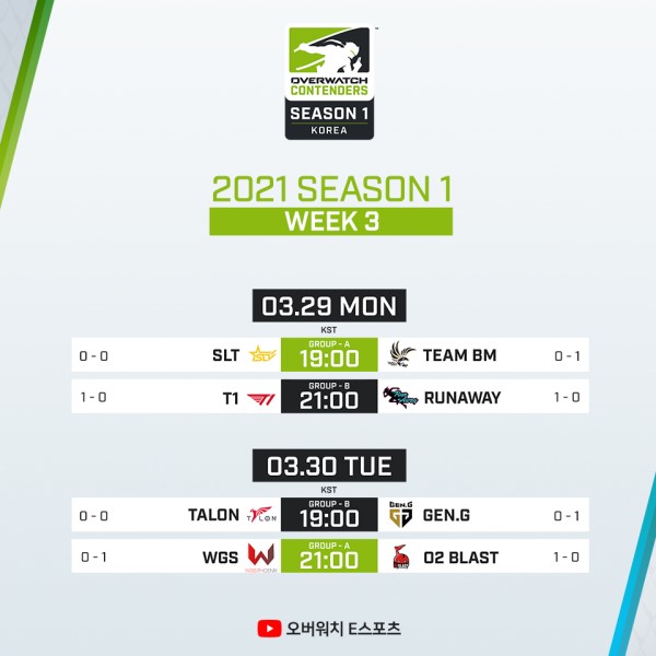 3주차 경기를 포함해 올 시즌 오버워치 컨텐더스 코리아는 오버워치 e스포츠 유튜브 채널을 통해 전 경기 생중계된다.