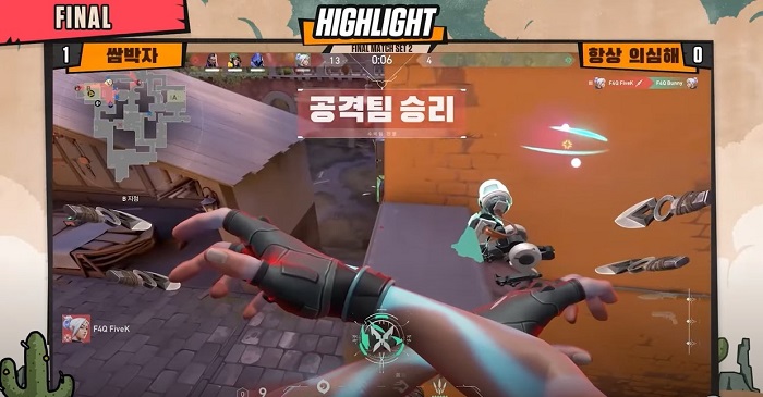 막상막하의 실력을 가진 두 팀의 결승전은 3판 2선승제로 진행됐다. 첫 번째 경기는 발로란트 공식 페이스북 채널에서 진행한 시청자 참여 사전투표에 의해 선정된 ‘아이스박스’ 맵에서 치뤄져 눈길을 끌었다. 쌈박자 팀의 선 수비로 시작한 1세트는 팀장 손오천과 실프의 활약이 돋보인 경기였다. 이들은 단단한 수비력을 바탕으로 7 대 0으로 상대를 압도하는 모습을 보였다. 이후 항상 의심해 팀이 전략적인 플레이로 스코어를 3점 차까지 줄이며 역전의 기회를 잡는 듯했으나, 쌈박자 팀이 끝까지 집중력을 발휘하며 13 대 9로 1세트를 차지했다. 2세트는 항상 의심해 팀의 선택으로 ‘어센트’ 맵에서 진행됐다. 항상 의심해 팀은 경기 시작부터 1세트 패배를 만회하기 위해 분전했으나, 침착하게 상대 팀의 전략을 파훼하며 센스있는 플레이를 펼친 쌈박자 팀이 13대 4의 압도적 스코어로 최종 우승을 차지했다.