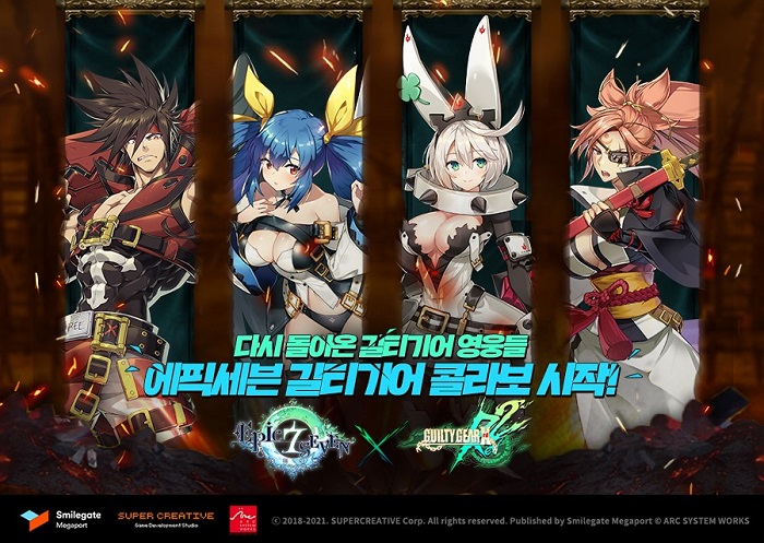 [자료제공 = 스마일게이트] 스마일게이트 메가포트(대표 장인아)는 자사가 서비스하고 슈퍼크리에이티브(김형석, 강기현 공동대표)가 개발한 글로벌 히트 모바일 RPG ‘에픽세븐’에 대전 액션게임의 명작 ‘길티기어 이그저드 레브 투(GUILTY GEAR Xrd REV 2, 이하 길티기어)’와 함께하는 콜라보레이션 이벤트를 다시 한번 선보인다고 2일 밝혔다.