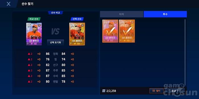 '10 류현진' EX(좌)와 골든글러브(우) 카드 비교, EX가 항목별로 2스탯씩 총합 12스탯이 더 높다 = 게임조선 촬영