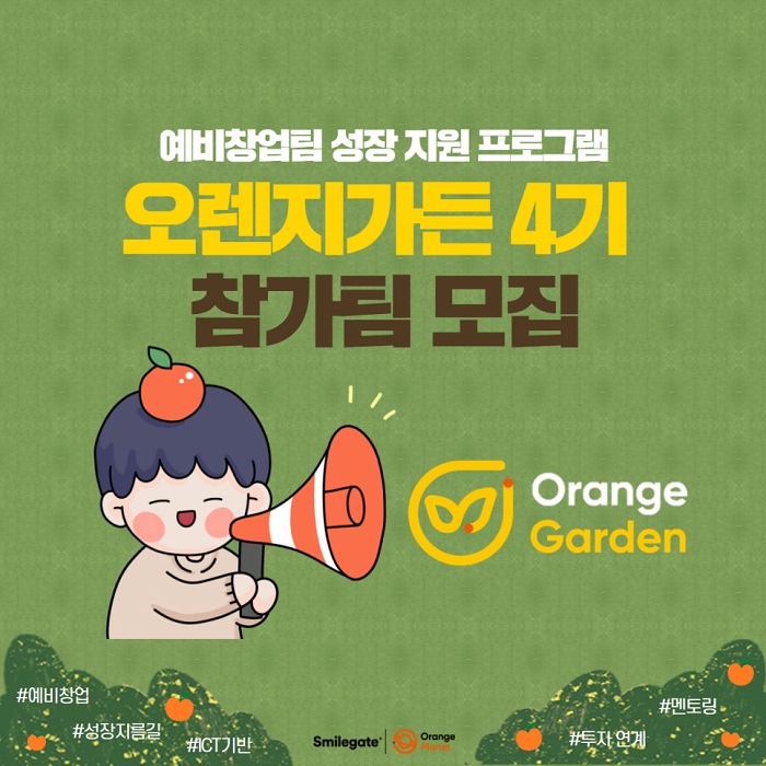 [자료제공 = 스마일게이트] 스마일게이트 희망스튜디오(이사장 권혁빈)가 운영하고 있는 스타트업 창업 플랫폼 오렌지플래닛이 총 4개월간의 예비창업팀 성장 지원 프로그램인 '오렌지가든(Orange Garden)'에 참가할 예비창업팀을 모집한다고 21일 밝혔다.