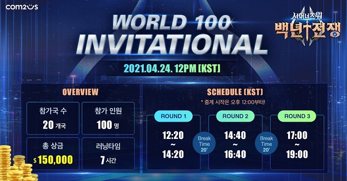 한국 시간 기준으로 24일 12시부터 개최되는 이번 행사는 국내 최대 MCN인 다이아 티비를 통해 실시간 생중계된다. 생중계 방송 시청은 ‘World 100 Invitational’ 공식 사이트와 컴투스 유튜브 채널에서 가능하다.