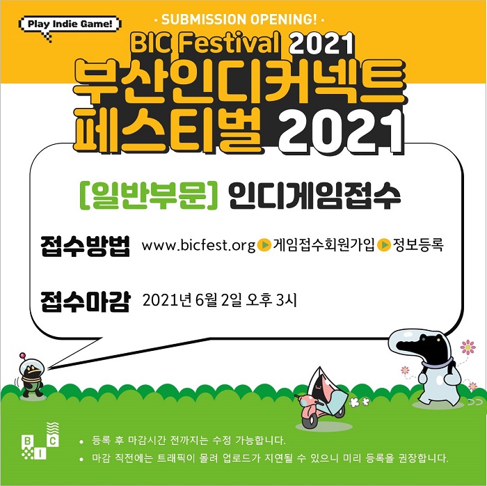 일반부문의 접수 기간은 4월 30일부터 6월 2일까지다. 스스로를 인디게임 개발자라고 자각하는 개인 또는 단체라면 누구나 ‘BIC 페스티벌’ 공식 홈페이지에서 신청할 수 있으며, 이번 접수를 통해 최종 선정된 인디게임 개발자는 BIC 페스티벌 2021에 참여할 자격을 획득하게 된다.