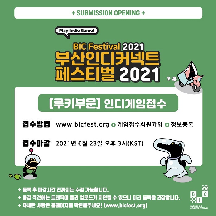 루키부문의 접수 기간은 5월 21일부터 6월 23일까지다. 스스로를 인디게임 개발자라고 자각하는 만 14세 이상 25세 이하(학생 또는 25세 이하의 미취업자) 개인 또는 단체라면 누구나 ‘BIC 페스티벌’ 공식 홈페이지에서 신청할 수 있다.