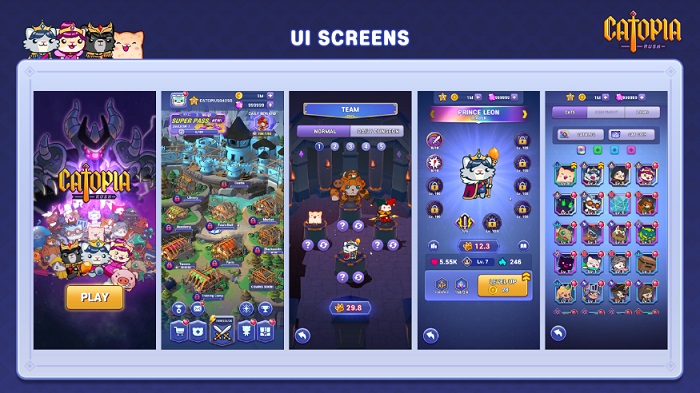 ‘캣토피아: 러쉬’는 어둠의 세력 ‘다크로드’에게 납치당한 ‘레나 공주’와 주민들을 구하기 위해 길을 떠나는 ‘레온 왕자’의 모험기를 그리고 있다. 고양이를 모티브로 제작된 50종 이상의 캐릭터가 준비돼 있으며, 이들 중 하나를 택해 전투 스테이지에 참여할 수 있다. 각 스테이지의 맵 지형과 장애물을 활용해 적에게 슈팅 공격을 가하고 적의 공격은 피하는 것이 게임 플레이의 핵심이다.
