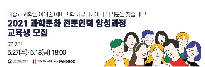 2021 과학문화 크리에이터 양성 프로그램에는 미래의 과학 크리에이터를 꿈꾸는 사람이라면 성별, 나이, 직업에 관계없이 누구나 오는 6월 18일까지 과학문화 전문인력 플랫폼에서 접수 가능하다. 서류와 면접심사까지 거쳐 최종 선발된 35명의 3기 교육생들은 향후 샌드박스의 전문 교육팀이 설계한 맞춤 교육의 수강 기회는 물론, 전문가와의 1:1 멘토링과 채널 브랜딩, 편집 노하우 등 업계 최고 전문가들로부터 수준 높은 컨설팅을 제공받게 된다.