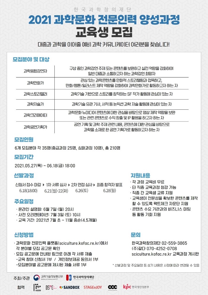 실습비를 포함한 수강료 등은 일체 지원되며, 우수 수료생으로 선발되면 과학문화 콘텐츠 수요 기관과의 비즈니스 매칭 등 채널 운영과 접목시킬 다양한 기회들도 적극 제공할 예정이다.