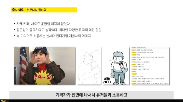 서울 2033의 개발사 반지하게임즈의 공동대표 및 기획자 이유원은 넥슨 개발자 콘퍼런스 둘째 날인 10일, "포스트모뎀 - 텍스트 게임으로 살아남기"라는 주제로 서울 2033을 기획하고 개발했던 과정을 공유하면서 인디 게임 개발자로서 도움이 되었던 점을 강연했다.