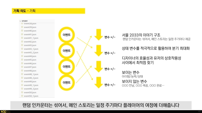 게임 속에서 일어나는 이벤트와 상호 변수 작용에 대한 무한한 확장성을 설계하는 것도 중요한 관건이었다고 언급했다. 서울 2033이 고안한 방식은 상시로 출현하는 랜덤 인카운터에 메인 스토리 진행은 일정 주기마다 확정적으로 등장하는 방식이었다.