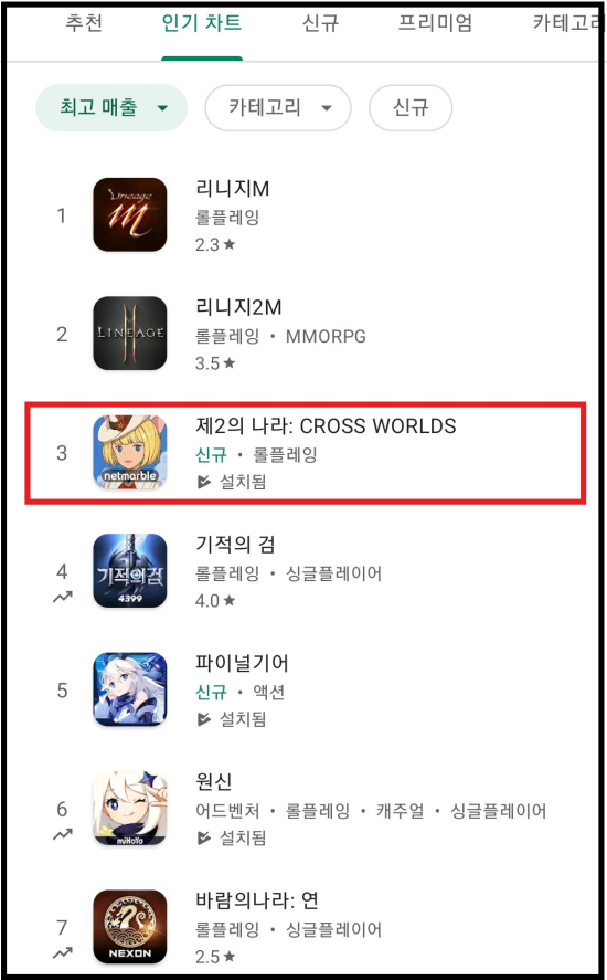 넷마블이 서비스 중인 모바일 MMORPG '제2의 나라'가 12일 구글 플레이스토어 최고 매출 순위 3위를 달성했다.