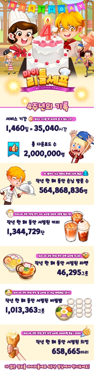 이번 인포그래픽은 ‘마이리틀셰프’의 다양한 콘텐츠를 유저들이 얼마나 즐겼는지 들여다볼 수 있다. 지난 4년간 유저들과 함께한 놀랍고 흥미로운 기록들을 실제 통계 지표와 접목하여 재미를 더했다.