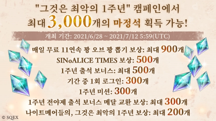 SINoALICE TIMES 보상으로 ‘마정석 500개’ 지급.