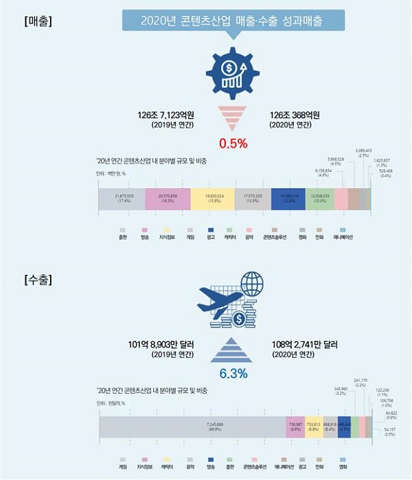2020년 국내 콘텐츠산업의 연간 매출액은 전년 대비 0.5% 감소한 126조로 집계됐다. 콘텐츠산업은 그간 연이은 성장을 이어왔으나, 코로나19 여파로 지난 2008년 글로벌 금융위기로 인해 전년 대비 1.1% 매출액 하락을 기록한 이후로 12년 만에 역성장을 기록했다. 다만, 비대면 라이프스타일과 비즈니스의 확산에 따라 콘텐츠 소비가 증가하면서 2008년보다는 매출 감소폭이 크지 않은 것으로 나타났다.
